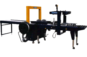 該打包機為自動封箱機,具有自動封箱,自動捆扎,光電感應,精確無誤,自動輸送,自動轉向等功能,可調節打包距離。